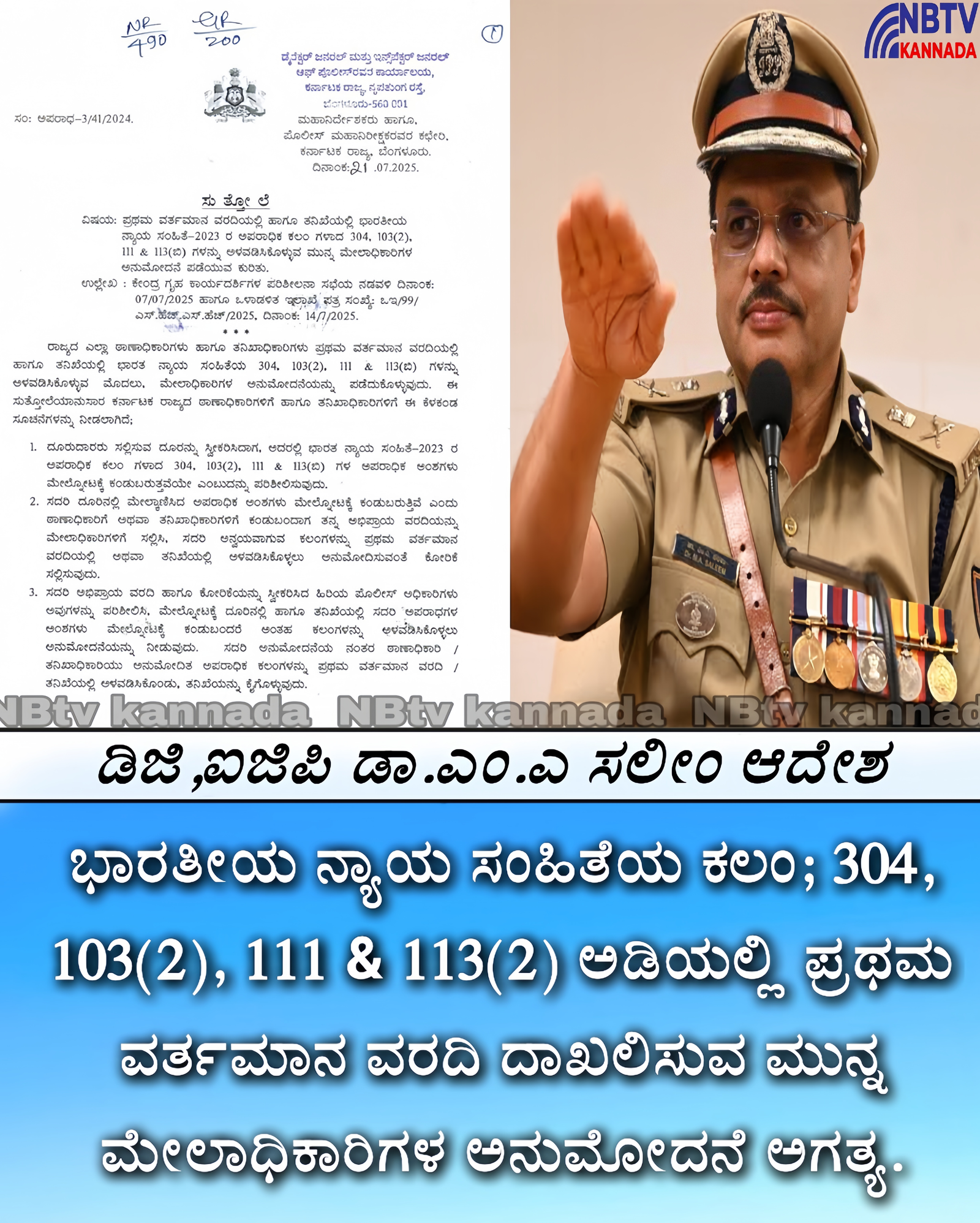 ಬಿಎನ್ಎಸ್ ಕೆಲವು ಕಲಂಗಳಲ್ಲಿ ಎಫ್ಐಆರ್ ಗೆ ಮುನ್ನ ಮೇಲಾಧಿಕಾರಿಗಳ ಅನುಮೋದನೆ ಅಗತ್ಯ: ಡಿಜಿ, ಐಜಿಪಿ ಡಾ. ಎಂ. ಎ. ಸಲೀಂ ಆದೇಶ.